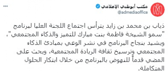 ونشر مكتب أبو ظبي للإعلام في تغريدة على حسابه بموقع التدوين المصغر تويتر، اليوم تفاصيل عن الاجتماع، قائلا: "ذياب بن محمد بن زايد يترأس اجتماع اللجنة العليا لبرنامج "سمو الشيخة فاطمة بنت مبارك للتميز والذكاء المجتمعي".