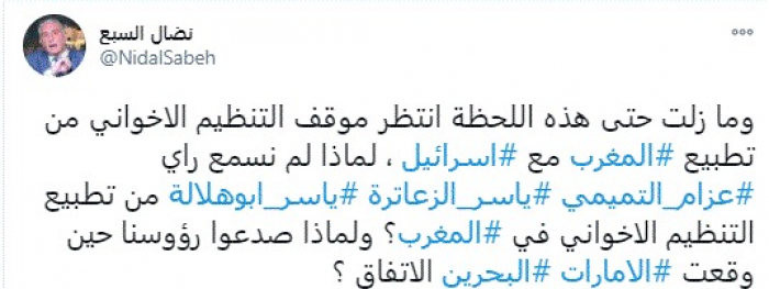 وقال في تغريدة عبر "تويتر" رصدها "المشهد العربي": "وما زلت حتى هذه اللحظة انتظر موقف التنظيم الإخواني من تطبيع المغرب مع إسرائيل، لماذا لم نسمع رأي عزام التميمي ياسر الزعاترة ياسر أبوهلالة من تطبيع التنظيم الإخواني في المغرب؟ ولماذا صدعوا رؤوسنا حين وقعت الإمارات البحرين الاتفاق؟".