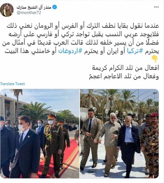 وقال في تغريدة عبر "تويتر" رصدها "المشهد العربي": "عندما نقول بقايا ... الترك أو الفرس أو الرومان نعني ذلك فلا يوجد عربي النسب يقبل تواجد تركي أو فارسي على أرضه فضلًا من أن يسير خلفه لذلك قالت العرب قديمًا في أمثال من يحترم تركيا أو إيران أو يحترم أردوغان أو خامنئي هذا البيت.. أفعال من تلد الكرام كريمة.. وفعال من تلد الأعاجم أعجمُ".