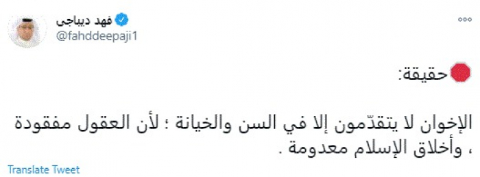 وقال في تغريدة عبر "تويتر" رصدها "المشهد العربي": "حقيقة: الإخوان لا يتقدّمون إلا في السن والخيانة؛ لأن العقول مفقودة، وأخلاق الإسلام معدومة".