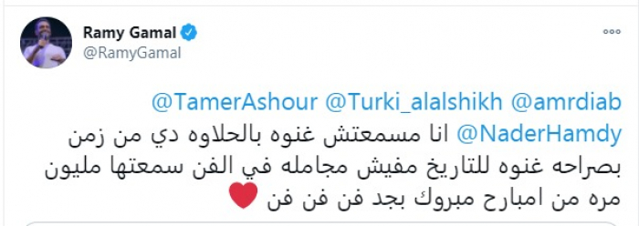 كتب رامي جمال تغريدة، عبر حسابه الرسمي بموقع "تويتر": "أنا مسمعتش غنوه بالحلاوة دي من زمن بصراحة غنوه للتاريخ مفيش مجاملة في الفن سمعتها مليون مرة من إمبارح مبروك بجد فن فن فن".