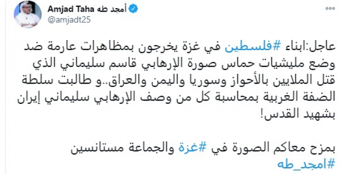 وقال في تغريدة عبر "تويتر" رصدها "المشهد العربي": "أبناء فلسطين في غزة يخرجون بمظاهرات عارمة ضد وضع مليشيات حماس صورة الإرهابي قاسم سليماني الذي قتل الملايين بالأحواز وسوريا واليمن والعراق..وطالبت سلطة الضفة الغربية بمحاسبة كل من وصف الإرهابي سليماني إيران بشهيد القدس! بمزح معاكم الصورة في غزة والجماعة مستأنسين".