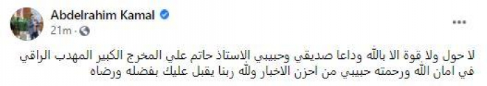 أعلن الخبر السيناريست عبد الرحيم كمال، ونشر صورة له مع حاتم علي عبر حسابه بموقع "فيسبوك"، وعلّق: "لا حول ولا قوة إلا بالله.. وداعا صديقي وحبيبي الأستاذ حاتم علي المخرج الكبير المهذب الراقي.. في أمان الله ورحمته حبيبي.. من أحزن الأخبار والله ربنا يُقبل عليك بفضله ورضاه".