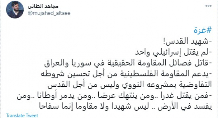 وقال في تغريدة عبر "تويتر" رصدها "المشهد العربي": "شهيد القدس! لم يقتل إسرائيلي واحد قاتل فصائل المقاومة الحقيقية في سوريا والعراق يدعم المقاومة الفلسطينية من أجل تحسين شروطه التفاوضية بمشروعه النووي وليس من أجل القدس".