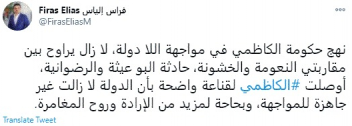وكتب في تغريدة عبر "تويتر" رصدها "المشهد العربي": "نهج حكومة الكاظمي في مواجهة اللا دولة، لا زال يراوح بين مقاربتي النعومة والخشونة، حادثة البو عيثة والرضوانية، أوصلت الكاظمي لقناعة واضحة بأن الدولة لا زالت غير جاهزة للمواجهة، وبحاحة لمزيد من الإرادة وروح المغامرة".