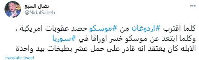 وقال في تغريدة عبر "تويتر" رصدها "المشهد العربي": "كلما اقترب أردوغان من موسكو حصد عقوبات أمريكية، وكلما ابتعد عن موسكو خسر أوراقا في سوريا.. .... كان يعتقد أنه قادر على حمل عشر بطيخات بيد واحدة".