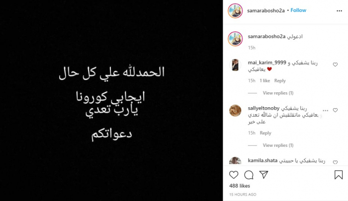 وكتبت "سمر" عبر حسابها بموقع "إنستجرام":"الحمد لله على كل حال، إيجابي كورونا، يارب تعدي دعواتكم".