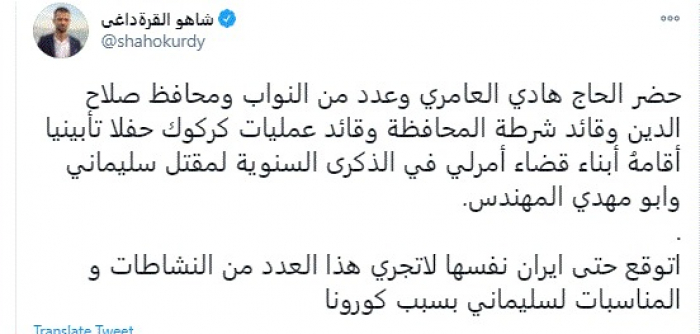 وقال في تغريدة عبر "تويتر" رصدها "المشهد العربي": "حضر الحاج هادي العامري وعدد من النواب ومحافظ صلاح الدين وقائد شرطة المحافظة وقائد عمليات كركوك حفلا تأبينيا أقامهُ أبناء قضاء أمرلي في الذكرى السنوية لمقتل سليماني وأبو مهدي المهندس".