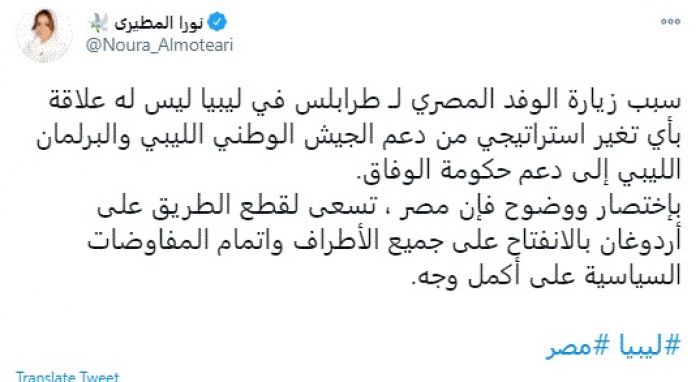وقالت في تغريدة عبر "تويتر" رصدها "المشهد العربي": "سبب زيارة الوفد المصري لـ طرابلس في ليبيا ليس له علاقة بأي تغير استراتيجي من دعم الجيش الوطني الليبي والبرلمان الليبي إلى دعم حكومة الوفاق".