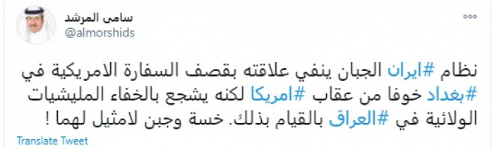 وقال في تغريدة عبر "تويتر" رصدها "المشهد العربي": "نظام إيران الجبان ينفي علاقته بقصف السفارة الأمريكية في بغداد خوفا من عقاب أمريكا لكنه يشجع بالخفاء المليشيات الولائية في العراق بالقيام بذلك. خسة وجبن لا مثيل لهما".