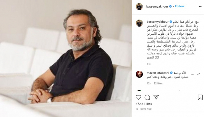 عن صفحات "انستغرام" لم يغب حاتم علي، فكان حاضراً على حساب السوري قصي خولي الذي كتب "رحل المبدع حاتم علي"، بينما كتب باسم ياخور: "ترجل الفارس مبكراً عن صهوة جواده، تاركاً في قلوب الكثيرين غصة مؤلمة لن تنسى وابداعات لن تنسى، رجل مبدع .. التغريبة الفلسطينية، والملك فاروق والزير سالم وصلاح الدين وصقر قريش..".
