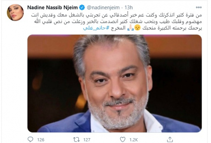 حاتم علي لم يغب عن ذاكرة النجمة اللبنانية نادين نسيب نجيم، والتي قالت: "من فترة تذكرتك، وكنت أخبر أصدقائي عن تجربتي بالعمل معك، وكم أنت مهضوم، وقلبك طيب، وتحب عملك كثيراً".