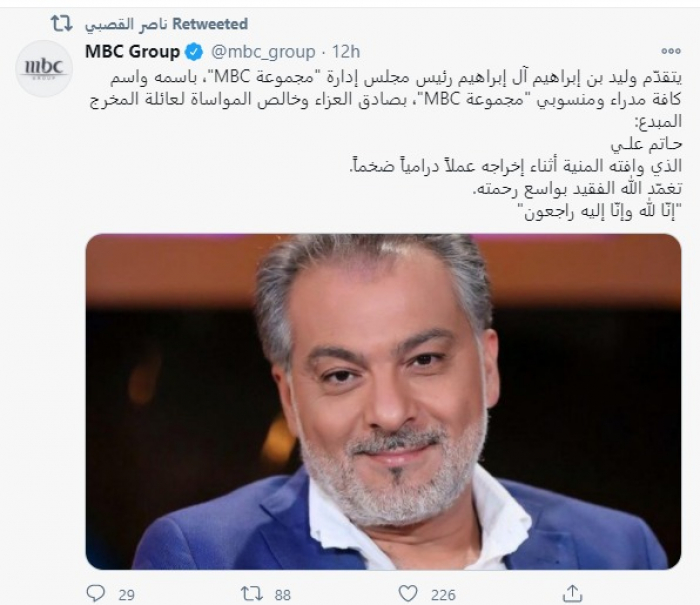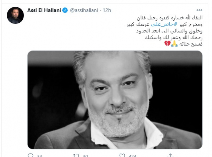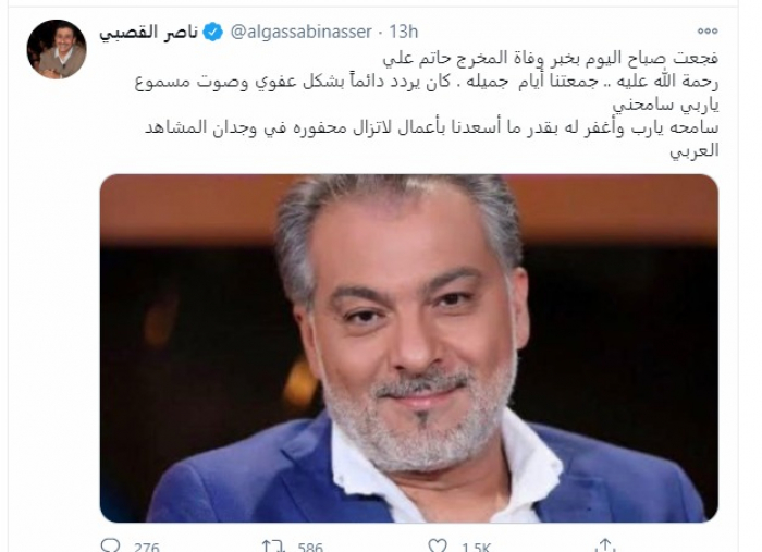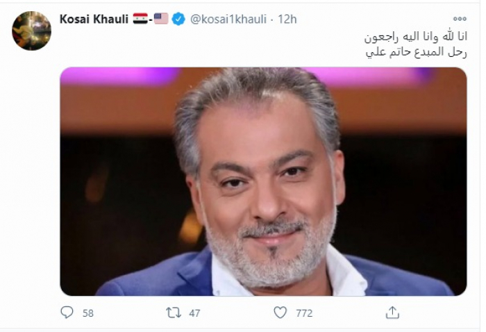وأعلن الخبر السيناريست المصري عبد الرحيم كمال، ونشر صورة له مع حاتم علي عبر حسابه بموقع "فيسبوك"، وعلّق: "لا حول ولا قوة إلا بالله.. وداعا صديقي وحبيبي الأستاذ حاتم علي المخرج الكبير المهذب الراقي.. في أمان الله ورحمته حبيبي.. من أحزن الأخبار والله ربنا يُقبل عليك بفضله ورضاه".