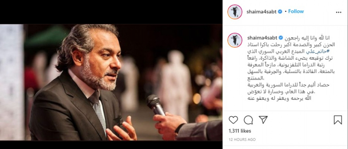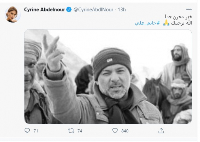 وقالت اللبنانية سيرين عبدالنور :"خبر حزين.. الله يرحمك حاتم علي".