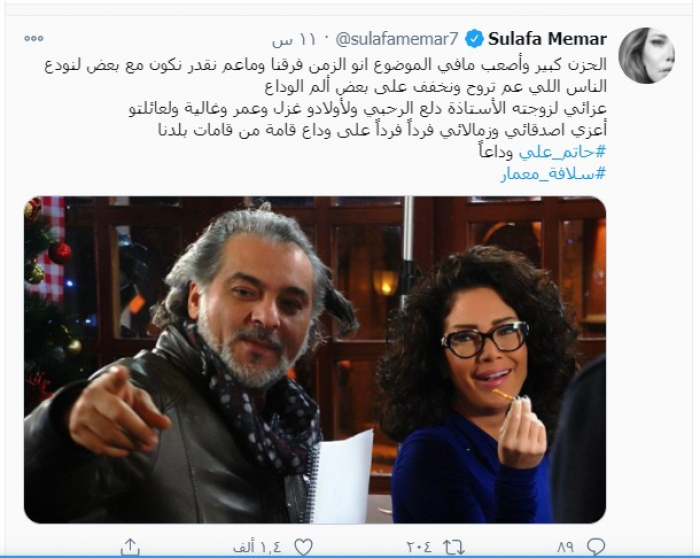 أما زميلتها سلافة معمار فقالت :" الحزن كبير وأصعب مافي الموضوع انو الزمن فرقنا وماعم نقدر نكون مع بعض لنودع الناس اللي عم تروح ونخفف على بعض ألم الوداع.. عزائي لزوجته الأستاذة دلع الرحبي ولأولادو غزل وعمر وغالية ولعائلتو.. أعزي اصدقائي وزمالائي فرداً فرداً على وداع قامة من قامات بلدنا.. #حاتم_علي وداعاً".