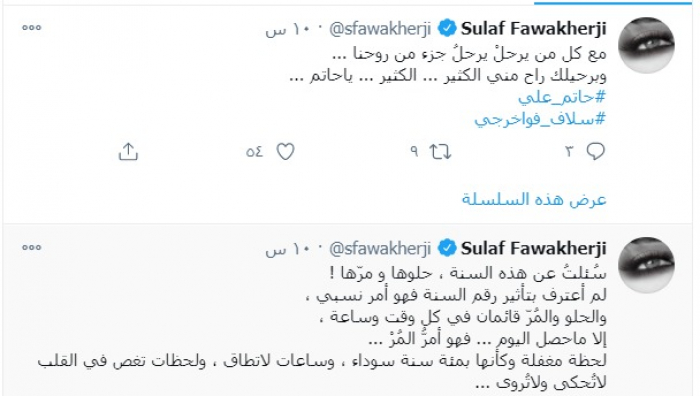 وأضافت :" مع كل من يرحلْ يرحلُ جزء من روحنا وبرحيلك راح مني الكثير ... الكثير ... ياحاتم".