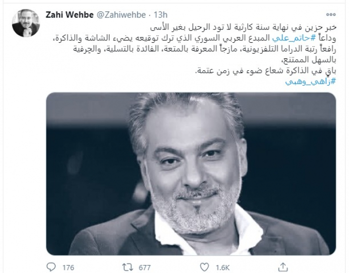 "باق في الذاكرة شعاع ضوء في زمن عتمة"، بهذه الكلمات رثاه الشاعر اللبناني زاهي وهبي، الذي قال في تغريدة له: "خبر حزين في نهاية سنة كارثية لا تود الرحيل بغير الأسى، وداعاً حاتم علي المبدع العربي السوري الذي ترك توقيعه يضيء الشاشة والذاكرة، رافعاً رتبة الدراما التلفزيونية، مازجاً المعرفة بالمتعة، الفائدة بالتسلية، والحِرفية بالسهل الممتنع".