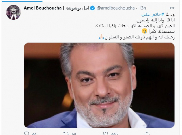 أما أمل بوشوه، فودعته بحزن لافت، حيث قالت: "وداعاً حاتم علي .. الحزن كبير والصدمة أكبر ..رحلت باكراً استاذي، سنفتقدك كثيراً".