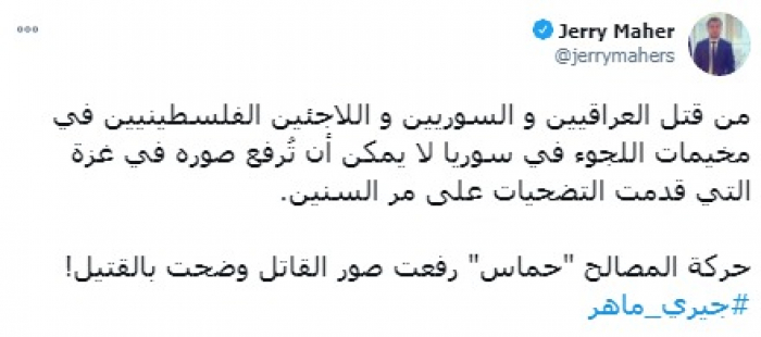 وشدد في تغريدة على حسابه بموقع التدوين المصغر تويتر، اليوم على أن: "من قتل العراقيين والسوريين واللاجئين الفلسطينيين في مخيمات اللجوء في سوريا لا يمكن أن تُرفع صوره في غزة التي قدمت التضحيات على مر السنين".