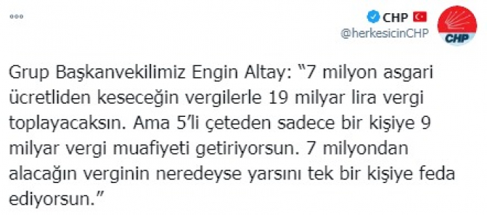 اتهم نائب رئيس حزب الشعب الجمهوري أنجين ألتاي، الرئيس التركي رجب طيب أردوغان، بمنح فرد واحد إعفاء ضريبي يعادل نصف قيمة الضرائب المحصلة من أصحاب الدخل الأدنى.