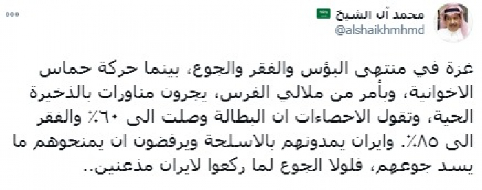 وأكد في تغريدة على حسابه بموقع التدوين المصغر تويتر، اليوم أن:"غزة في منتهى البؤس والفقر والجوع، بينما حركة حماس الاخوانية، وبأمر من ملالي الفرس، يجرون مناورات بالذخيرة الحية".