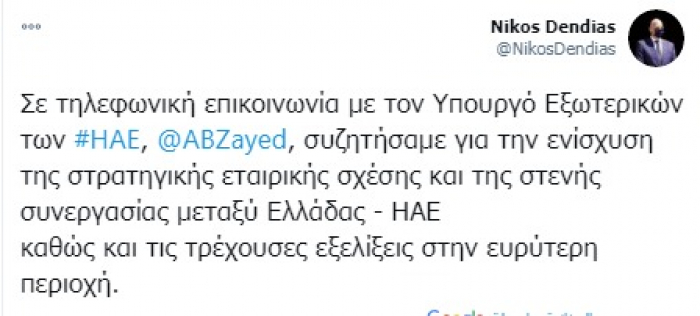 وكشف الوزير اليوناني في تغريدة على حسابه بموقع التدوين المصغر تويتر، اليوم أنه أجرى: "محادثة هاتفية مع وزير الخارجية الإماراتي عبدالله بن زايد"، موضحا أنها تطرقت إلى: "تعزيز الشراكة الاستراتيجية والتعاون الوثيق بين اليونان والإمارات العربية المتحدة فضلا عن التطورات الحالية في المنطقة الأوسع".