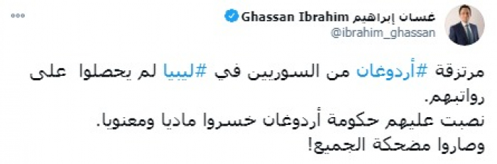 أكد الإعلامي السوري غسان إبراهيم، أن الرئيس التركي رجب طيب أردوغان نصب على المرتزقة السوريين في ليبيا.
