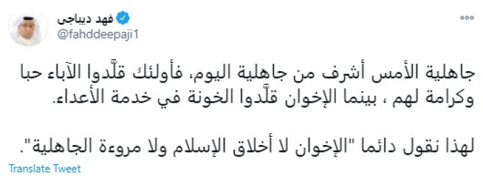 وقال في تغريدة عبر "تويتر" رصدها "المشهد العربي": "جاهلية الأمس أشرف من جاهلية اليوم، فأولئك قلَّدوا الآباء حبا وكرامة لهم ، بينما الإخوان قلَّدوا الخونة في خدمة الأعداء".