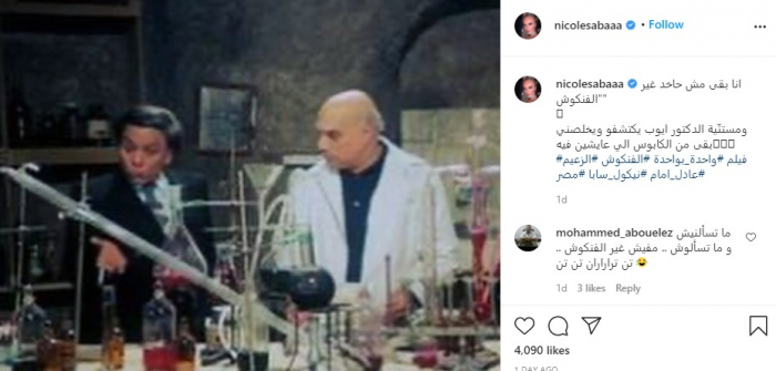الصورة التي نشرتها نيكول عبر حسابها على "إنستجرام"، من فيلم "واحدة بواحدة" (1984) للزعيم عادل إمام، والذي تدور أحداثه حول "صلاح فؤاد" الذي ينظم حملة إعلانية ضخمة عن سلعة وهمية تسمى "الفنكوش"، ويطلب من "الدكتور أيوب" أن يخترع له أي مادة بهذا الاسم لتسويقها.