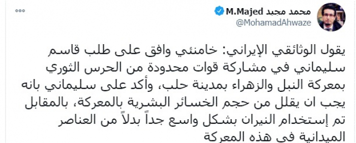 وكتب في تغريدة عبر "تويتر" رصدها "المشهد العربي": "يقول الوثائقي الإيراني خامنئي وافق على طلب قاسم سليماني في مشاركة قوات محدودة من الحرس الثوري بمعركة النبل والزهراء بمدينة حلب، وأكد على سليماني بانه يجب ان يقلل من حجم الخسائر البشرية بالمعركة، بالمقابل تم إستخدام النيران بشكل واسع جداً بدلاً من العناصر الميدانية في هذه المعركة".