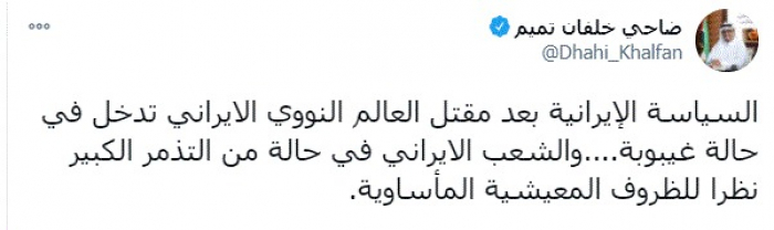 وكتب في تغريدة عبر "تويتر" رصدها "المشهد العربي": "السياسة الإيرانية بعد مقتل العالم النووي الايراني تدخل في حالة غيبوبة.. والشعب الايراني في حالة من التذمر الكبير نظرا للظروف المعيشية المأساوية".