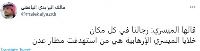 وكتب في تغريدة عبر "تويتر" رصدها "المشهد العربي": "قالها الميسري: رجالنا في كل مكان.. خلايا الميسري الإرهابية هي من استهدفت مطار عدن".