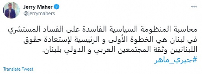 دعا الكاتب الصحفي اللبناني جيري ماهر، اليوم، لمحاسبة المنظومة السياسية في لبنان جراء الفساد المستشري في البلاد.