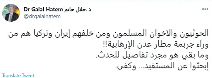 وقال في تغريدة عبر "تويتر" رصدها "المشهد العربي": "الحوثيون والإخوان المسلمون ومن خلفهم إيران وتركيا هم وراء جريمة مطار عدن الإرهابية".