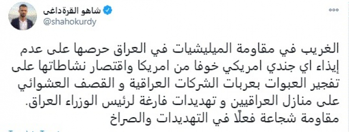 وقال في تغريدة عبر "تويتر" رصدها "المشهد العربي": "الغريب في مقاومة المليشيات في العراق حرصها على عدم إيذاء أي جندي أمريكي خوفا من أمريكا واقتصار نشاطاتها على تفجير العبوات بعربات الشركات العراقية والقصف العشوائي على منازل العراقيين وتهديدات فارغة لرئيس الوزراء العراق. مقاومة شجاعة فعلًا في التهديدات والصراخ".