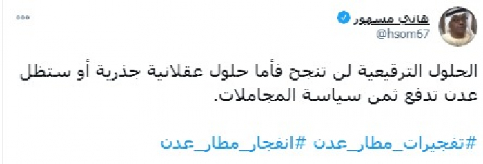وقال في تغريدة على حسابه بموقع التدوين المصغر تويتر، اليوم إن: "الحلول الترقيعية لن تنجح فإما حلول عقلانية جذرية أو ستظل عدن تدفع ثمن سياسة المجاملات".