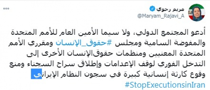 دعت زعيمة المعارضة الإيرانية مريم رجوي، الأمم المتحدة إلى التدخل إيقاف الإعدامات في سجون ملالي طهران.