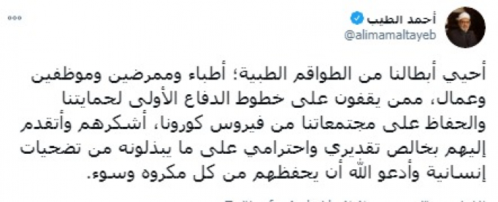 وجه الإمام الأكبر الدكتور أحمد الطيب، شيخ الأزهر الشريف، التحية إلى الطواقم الطبية العاملة في مجال مكافحة فيروس كورونا، مشيدا بتضحياتهم.