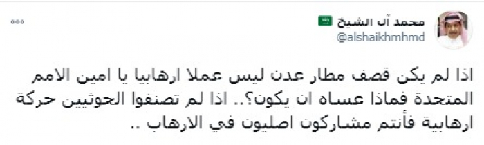 وتساءل في تغريدة على حسابه بموقع التدوين المصغر تويتر، اليوم قائلا: "إذا لم يكن قصف مطار عدن عملًا إرهابيًا يا أمين الأمم المتحدة فماذا عساه أن يكون؟".