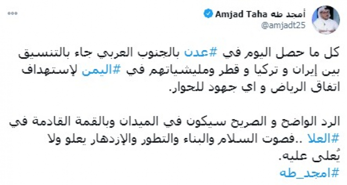 وشدد في تغريدة على حسابه بموقع التدوين المصغر تويتر، اليوم على أن: "ما حصل اليوم في عدن بالجنوب العربي جاء بالتنسيق بين إيران وتركيا وقطر ومليشياتهم في اليمن، لاستهداف اتفاق الرياض وأي جهود للحوار".