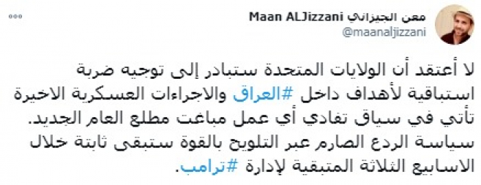 وأوضح في تغريدة على حسابه بموقع التدوين المصغر تويتر، اليوم أني: "لا أعتقد أن الولايات المتحدة ستبادر إلى توجيه ضربة استباقية لأهداف داخل العراق".