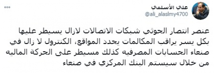 وقال في تغريدة على حسابه بموقع التدوين المصغر تويتر، اليوم، إن: "عنصر انتصار الحوثي شبكات الاتصالات"، مؤكدا أنه: "لا زال يسيطر عليها بكل يسر، يراقب المكالمات، يحدد المواقع، الكنترول لا زال في صنعاء".