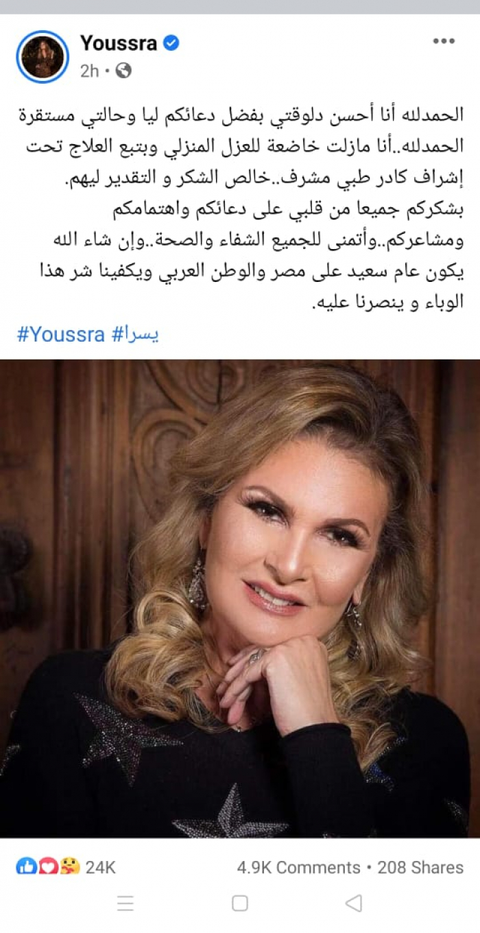 يسرا كشفت تطورات حالتها عبر صفحتها بموقع فيس بوك، وكتبت: "الحمد لله أنا أحسن دلوقتي بفضل دعائكم ليا وحالتي مستقرة الحمد لله، أنا ما زلت خاضعة للعزل المنزلي وبتبع العلاج تحت إشراف كادر طبي مشرف".