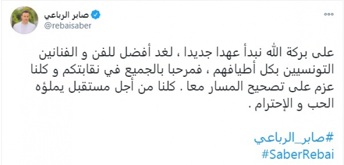 ونشر الرباعي، صورة من إعلان تأسيس النقابة، عبر حسابه على تويتر، وعلق: "على بركة الله.. نبدأ عهدًا جديدًا ، لغد أفضل للفن والفنانين التونسيين بكل أطيافهم، فمرحبًا بالجميع في نقابتكم وكلنا عزم على تصحيح المسار معًا .. كلنا من أجل مستقبل يملؤه الحب والإحترام".
