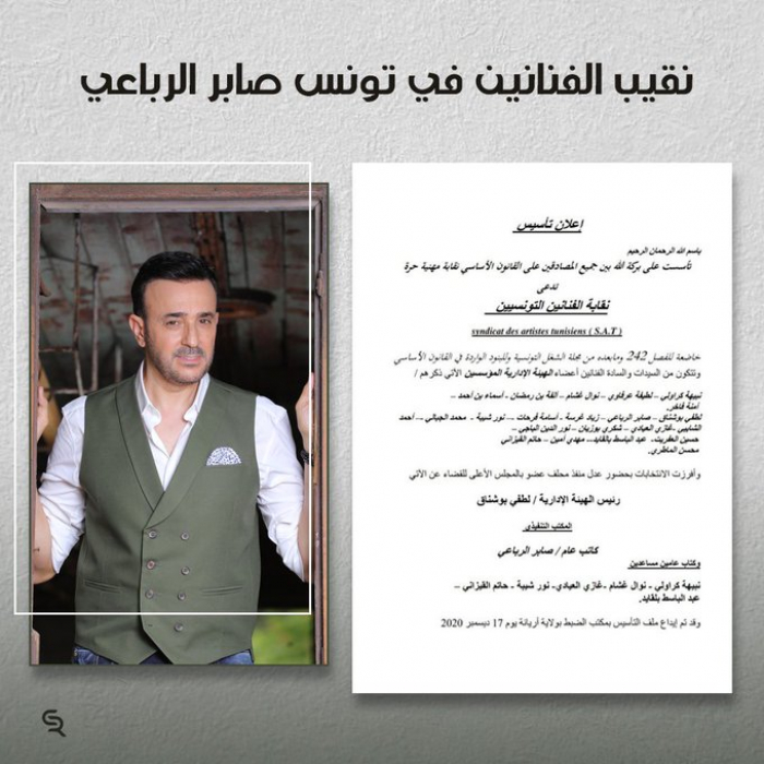 وأسس نجوم وفناني تونس أول نقابة للفنانين وأصدر إعلان تأسيسها، وتم إعلان أسماء أعضاء الهيئة الادارية المؤسسين، وهم: "لطيفة عرفاوي ونبيهة كراولي، نوال غشام، أمنة فاخر، ألفة بن رمضان، أسماء بن أحمد، لطفي بو شناق، صابر الرباعي، زياد غرسة، أسامة فرحات، نور شيبة، محمد الجبالي، أحمد الشايبي، غازي العيادي، شكري بوزيان، نور الدين الباجي، حسين العفريت، عبد الباسط بالقايد، مهدي أمين، حاتم الفيزاني، ومحسن الماطري".