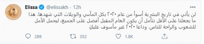وكتبت: "لن يأتي في تاريخ البشرية أسوأ من عام ٢٠٢٠ بكل المآسي والويلات التي شهدها، هذا ما يجعلنا على الأقل نتأمل أن يكون العام المقبل أفضل على الجميع، ليحمل الأمل للشعوب والراحة للناس، وداعا ٢٠٢٠ غير مأسوف عليكِ".
