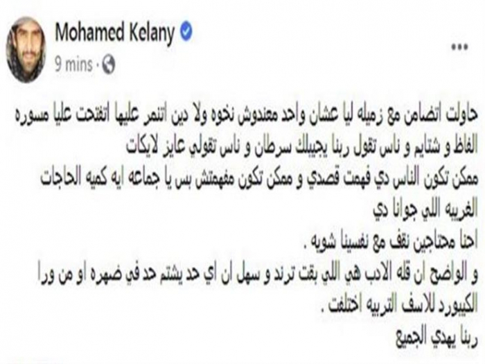 وكتب كيلاني، عبر حسابه على فيسبوك، قائلاً: "حاولت أتضامن مع زميله ليا عشان واحد معندوش نخوة ولا دين اتنمر عليها.. اتفتحت عليا ماسورة ألفاظ وشتايم وناس تقول ربنا يجيبلك سرطان، وناس تقولي عايز لايكات".