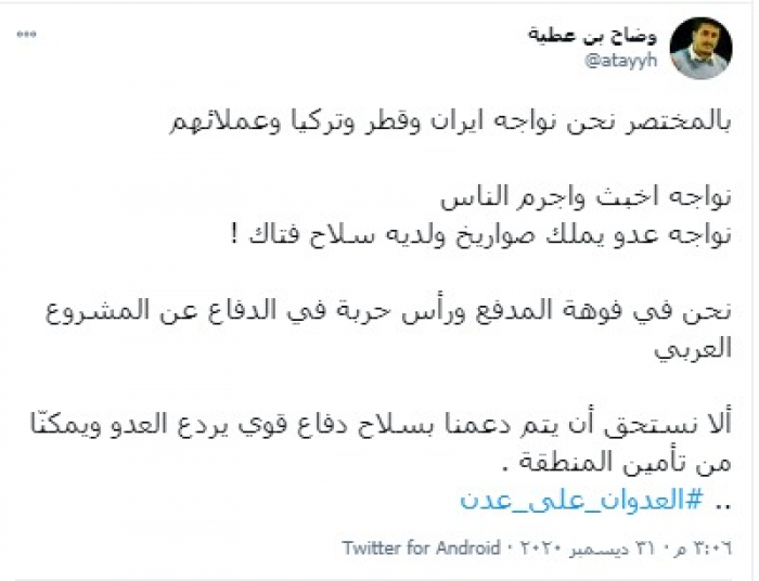 وكتب "بن عطية" تغريدة عبر حسابه بتويتر، رصدها "المشهد العربي": "بالمختصر نحن نواجه إيران وقطر وتركيا وعملائهم، نواجه أخبث وأجرم الناس، نواجه عدو يملك صواريخ ولديه سلاح فتاك".