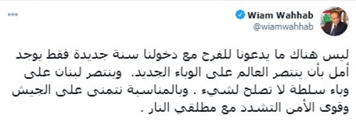 وأضاف: "وينتصر لبنان على وباء سلطة لا تصلح لشيء"، متابعا: "وبالمناسبة نتمنى على الجيش وقوى الأمن التشدد مع مطلقي النار".