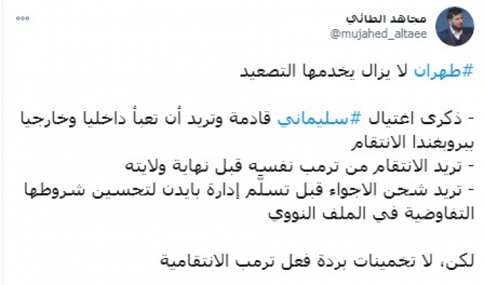 وأكد أنها: "تريد الانتقام من ترمب نفسه قبل نهاية ولايته، تريد شحن الأجواء قبل تسلَّم إدارة بايدن لتحسين شروطها التفاوضية في الملف النووي لكن، لا تخمينات بردة فعل ترمب الانتقامية".